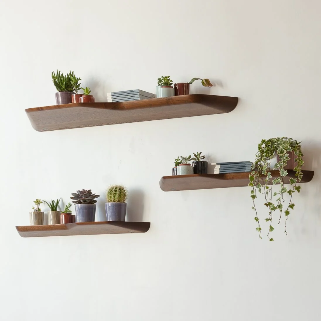 This floating shelf complements modern spaces with a sleek and simple design that comes in handy for extra storage or display space. Carved from solid wood, it hangs from the wall where it greets guests in an office, at a hotel, or in a lobby or lounge.